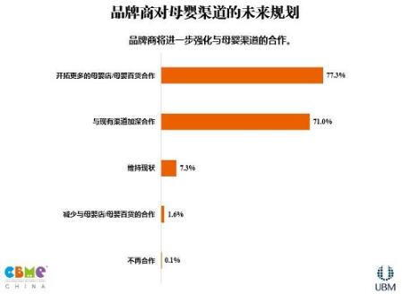 調(diào)查顯示:40.1%的品牌商的母嬰渠道銷售占總銷售額的50%以上,較上一年度略有下滑6.9%,但依然是品牌商的首選經(jīng)營渠道,77.3%的品牌商也表示將開拓更多的母嬰渠道合作。