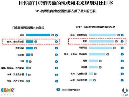 2016年,72%的壓倒多數(shù)零售商認(rèn)為需要加強和提高消費者體驗與服務(wù),遠(yuǎn)遠(yuǎn)超過其他零售商發(fā)展趨勢占比。在日本實體零售興盛的背景下,報告首次指出孕嬰童產(chǎn)業(yè)零售店的日均平效甚至不到日本藥妝店的一半,仍有很長的路要走。在零售商門店銷售額現(xiàn)狀和未來規(guī)劃中,50%的零售商其奶粉銷售額占據(jù)了最大的份額,而童裝、童鞋及棉品則位列未來門店最希望提高銷售額的品類。