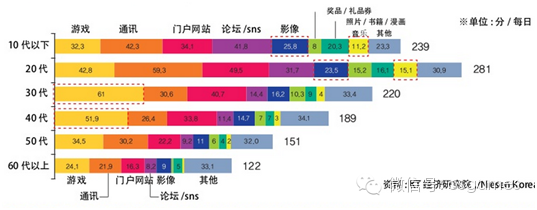 韓國不同年齡層在手機上使用的時間有所不同,其中20歲至60歲的人群在一天當中在游戲上花費的時間最多。總體而言,韓國群眾對游戲相當有熱情。