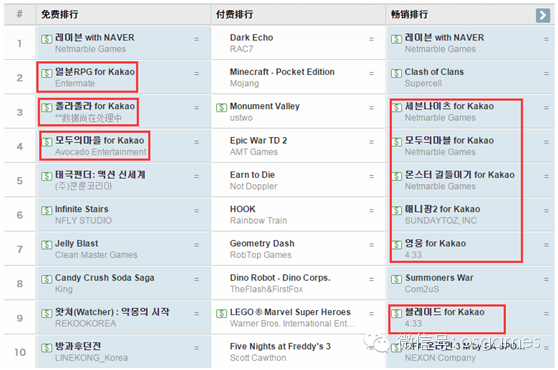 由于韓國的手機用戶幾乎都在使用KAKAOTALK,意味著KAKAO TALK上的游戲擁有超3千5百萬的國內用戶。Google商店暢銷游戲排行榜中10款中有6款通過Kakao平臺流通。Appstore暢銷游戲排行前10位中也有一半被Kakao游戲占領。(下圖是韓國GooglePlay排行榜)