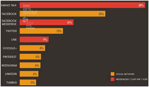 在韓國最熱門的社交軟件是KAKAO TALK,其次是FACEBOOK和TWITTER。