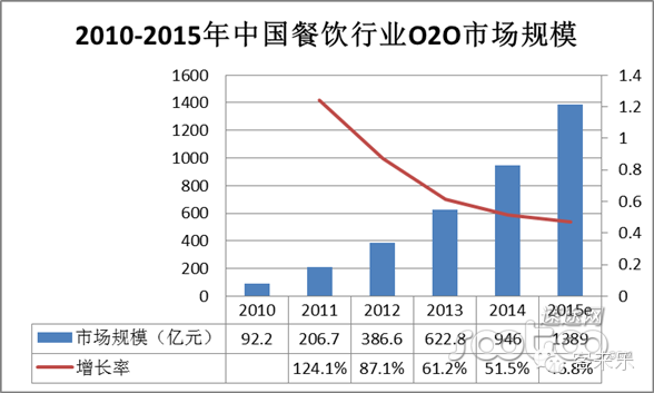 都說民以食為天,吃可以說是人生活一天所必須的環(huán)節(jié),而其帶來的市場潛力與規(guī)模更為巨大。從2013年開始移動(dòng)互聯(lián)網(wǎng)高速發(fā)展為在線餐飲市場的迅速發(fā)展奠定了堅(jiān)實(shí)的基礎(chǔ),到2014年在線外賣更是成為餐飲O2O中發(fā)展最為快速的產(chǎn)品迅速崛起。根據(jù)數(shù)據(jù)顯示,2014年中國餐飲行業(yè)O2O市場規(guī)模達(dá)到946億元,相比2013年增長51.5%;預(yù)計(jì)2015年中國餐飲行業(yè)O2O市場規(guī)模在2014年的基礎(chǔ)上將增長到1389億元。要知道2010年餐飲O2O市場規(guī)模僅為92.2億元,經(jīng)過5年的發(fā)展其規(guī)模翻了10倍。這些都與移動(dòng)互聯(lián)網(wǎng)的爆發(fā)式增長、移動(dòng)支付習(xí)慣的養(yǎng)成有著密不可分的關(guān)系,正是這些多種因素才造就了其龐大的市場規(guī)模。