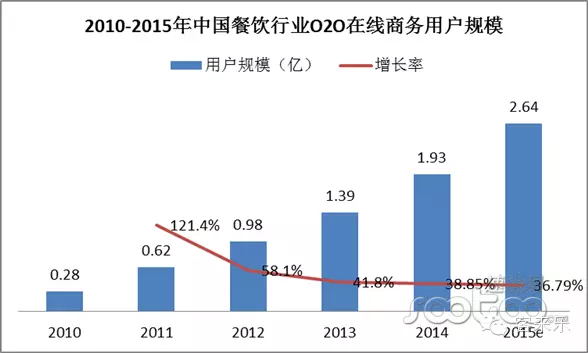 餐飲行業(yè)可以說是與人們?nèi)粘I盥?lián)系最緊密的行業(yè)之一,隨著移動(dòng)互聯(lián)網(wǎng)產(chǎn)業(yè)與在線支付功能的普及,越來越多的用戶開始嘗試在線預(yù)訂或者外賣,消費(fèi)模式的改變讓用戶也快速的增長。2014年中國餐飲行業(yè)O2O在線商務(wù)用戶規(guī)模達(dá)到1.93億,較2013年增長38.85%;2015年中國餐飲O2O在線市場規(guī)模將達(dá)到2.64億,比2014年增長36.79。隨著一線城市在線商務(wù)用戶增長逐步放緩,其用戶規(guī)模增長率將隨之下降,趨于平穩(wěn)化發(fā)展。