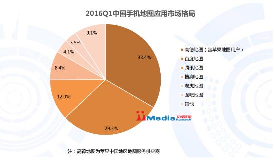 艾媒咨詢數據顯示,在當今眾多的手機地圖應用中,高德地圖穩居市場榜首,占市場份額33.4%,百度地圖稍稍落后占29.5%,騰訊地圖、搜狗地圖緊隨其后,老虎地圖、圖吧地圖在市場也占有一定比例。